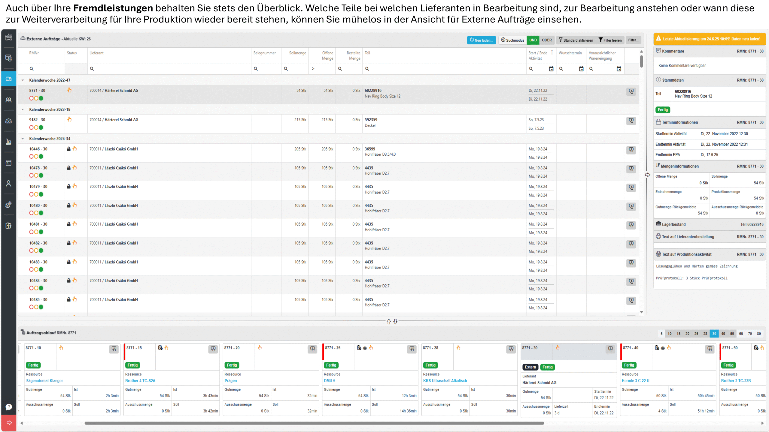 Je nach Komplexität und abhängig von Ihrer Softwarelandschaft rechnen wir mit einer Implementierungsdauer von einem bis drei Monaten. Unser Tool unterscheidet sich von veralteten ERP- und MES-Systemen, die einen überholten Leitstand besitzen. Nicht die Auftragserfassung, sondern die Produktionsüberwachung und -steuerung stehen im Mittelpunkt. Durch eine einfache Schnittstelle werden Daten aus Ihrem ERP-System oder Ihren Umsystemen importiert und übersichtlich dargestellt – intuitiv zum Bedienen und einfach verständlich.