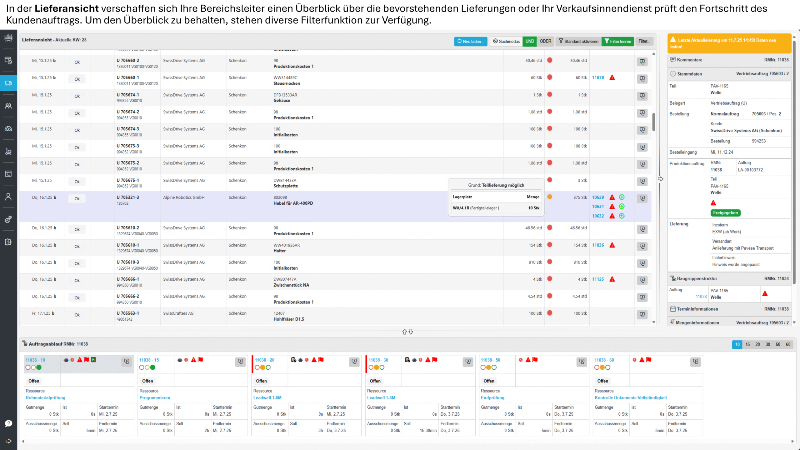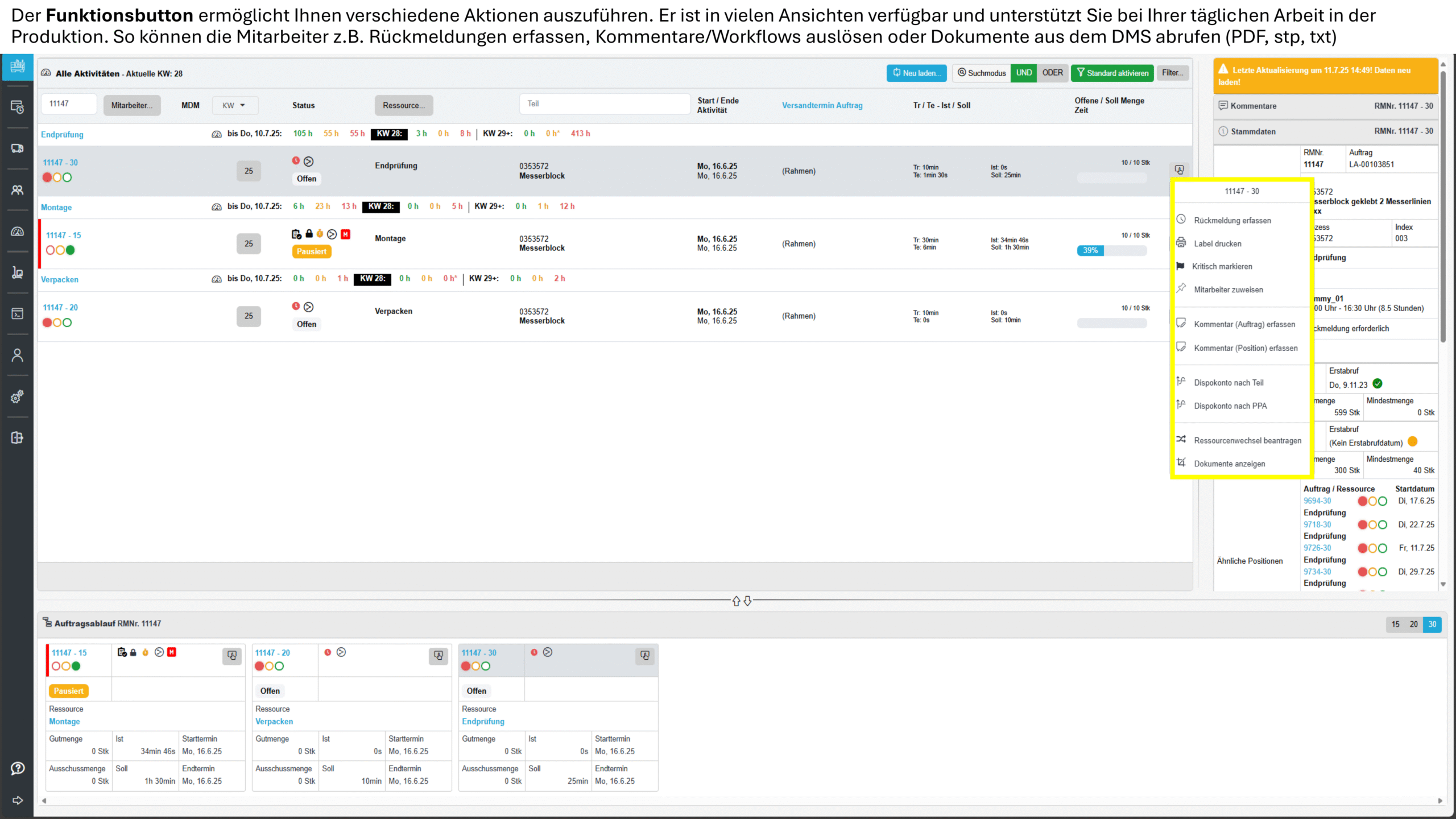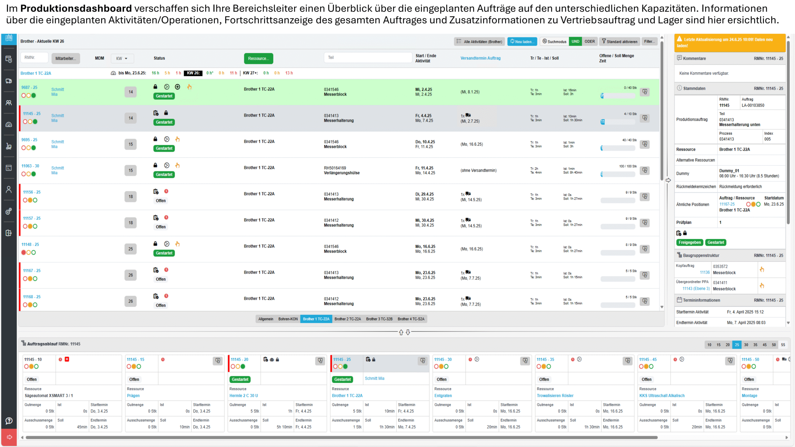 Produktionsüberwachung und -steuerung, Workflows, Arbeitsvorrat, Mitarbeiterplanung, Lager- und Vertriebsansicht, Kapazitätsauslastung
